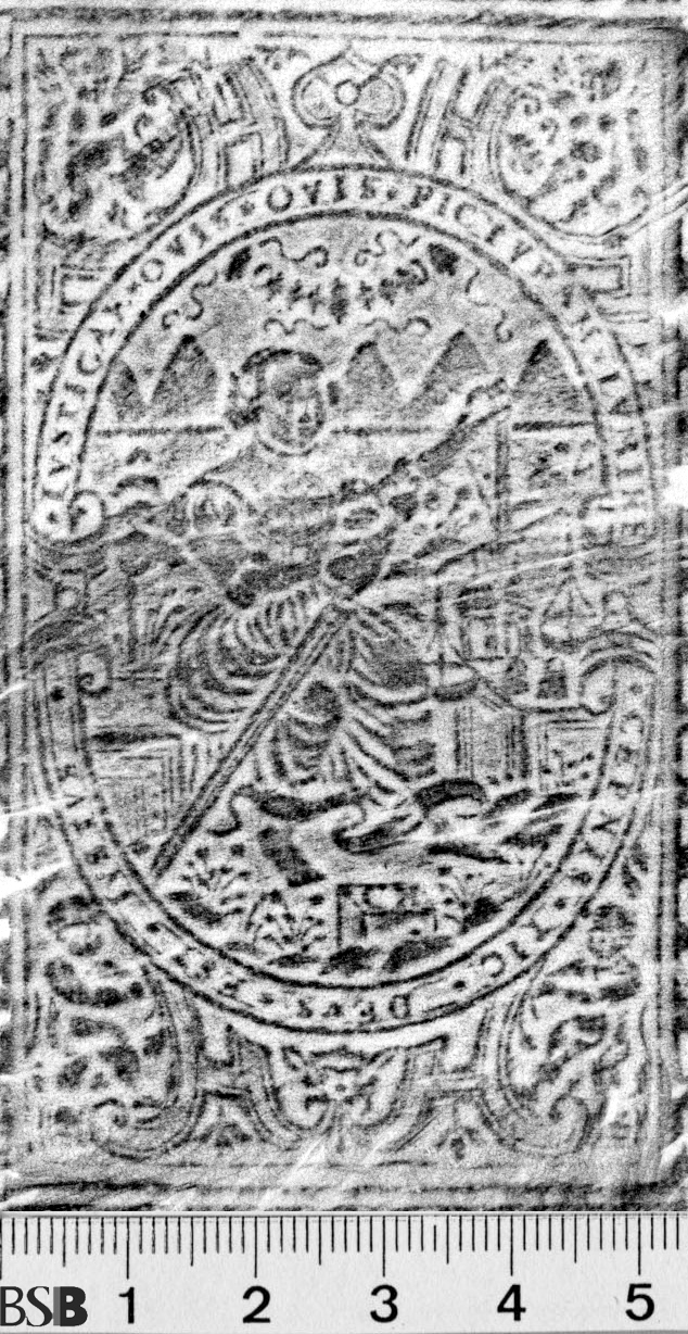 Zusätze: IVSTICIAE QVIS QVIS PICTVRAM LVMINE // CERNIS TIC DEVS EST IVSTVS (Umschrift)