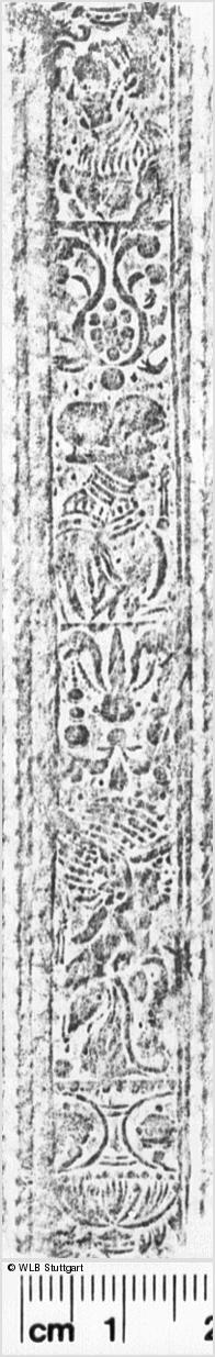 | Literaturverweise: | Schwenke-Schunke II, S. 203 f Sprandel-Krafft, Lore: Die spätgotischen Einbände an den Inkunabeln der Universitätsbibliothek Würzburg. Würzburg 2000 (Quellen und Forschungen zur Geschichte des Bistums und Hochstifts Würzburg ; 55), S. 129 (Nr. 106) Herz, Randall: Eingeritzte Dekorationen im Holzdeckel von Halbeinbänden des 15. Jahrhunderts. In: Einband-Forschung 18, 2006, S. 33-36, hier S. 34 f.